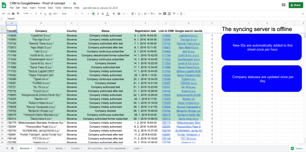 For Trans.EU and it’s Slovenian branch Logintrans d.o.o. a tool for syncing between company’s CRM and Google Sheet environment has been developed.